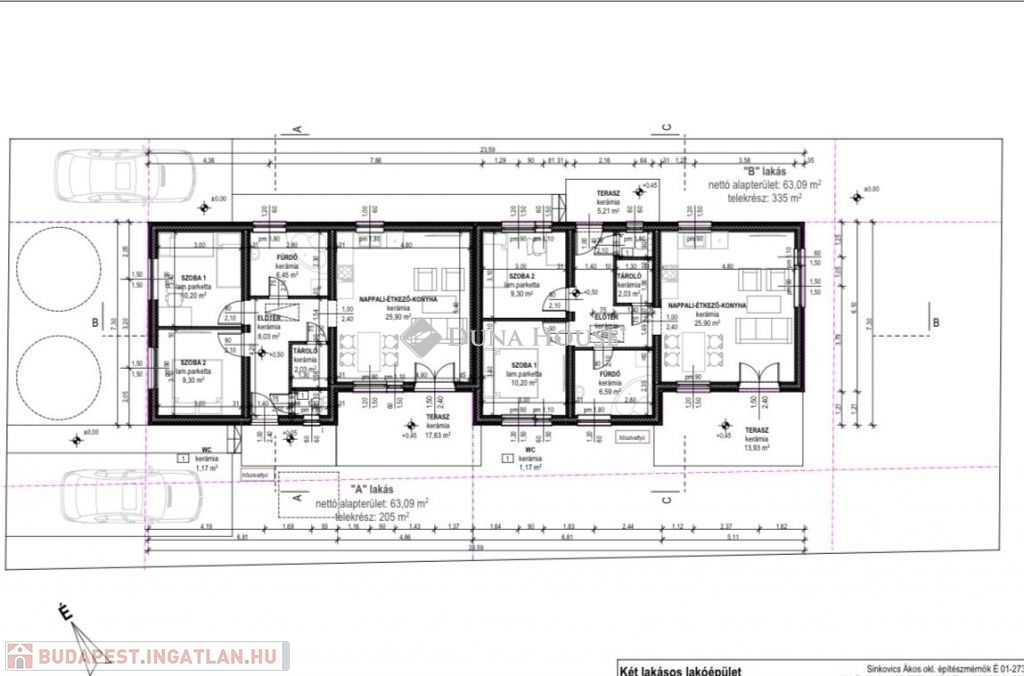 Kialakítása: 2 szoba, fürdő, külön wc, előtér, tároló, nappali+étkező konyha, 18 m2 nyitott terasz.