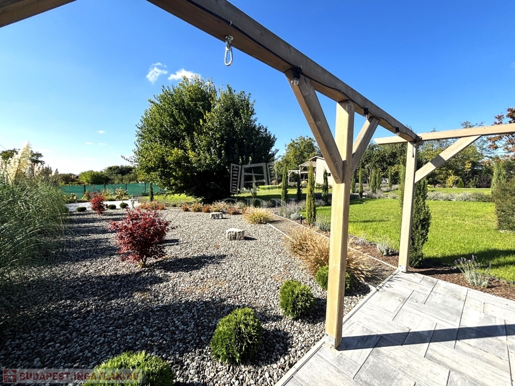 - A KÖRBÉKERÍTETT, füvesített kert dísznövényekkel és KERTI SÜTÖGETŐVEL, került kialakításra.