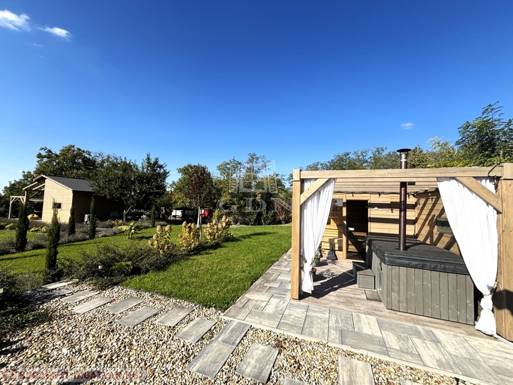- KÜLÖNÁLLÓ WELLNESS ÉPÜLET szaunával, dézsával, kinti zuhanyzóval, FEDDETT PIHENŐRÉSSZEL és hangulatos esti világítással.