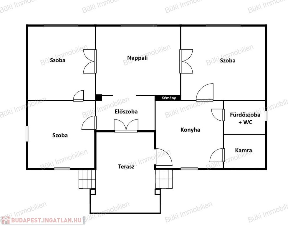 A méretes fedett teraszra érkezve több bejáraton keresztül is beléphet az ingatlanba függően attól, hogy a valamely szobát akarja inkább megközelíteni vagy pedig a baráti összejövetel miatt a konyhába igyekszik. Az ingatlan belül szinte teljesen körbejárható, szobáról szobára tudunk haladni, miközben az előtér lehetővé teszi, hogy a körbejárás csak opció maradjon, és ne legyen szükség.