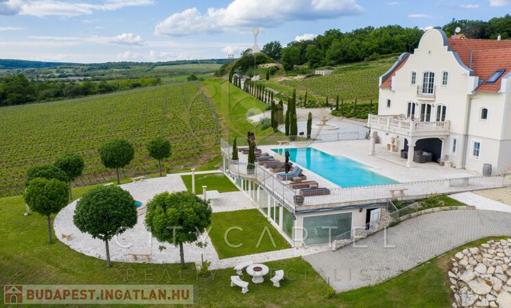 FESTŐI környezetben, a Balatonhoz közel kínálok eladásra egy francia Chateaux stílusban megépített, eklektikus, CSODÁLATOS panorámás, 2250 nm alapterületű, FELÚJÍTOTT, 3 szintes, 9 szobás BORBIRTOKOT a hozzá tartozó 10 hektárnyi szőlőtermő területtel!