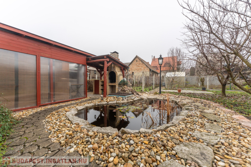 • fóliasátor, medencének kialakított terület és kis kerti tó