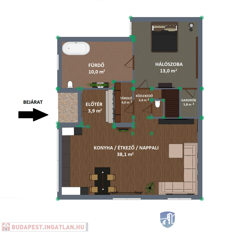 Az ingatlan a város egyik legjobb lakóparkjában található. A belső tér kialakítása, a burkolatok, a felhasznált anyagok, a dekorvilágítás mind azt az érzetet erősítik, hogy aki itt lakik, az igényes és nem a tucat megoldások híve.