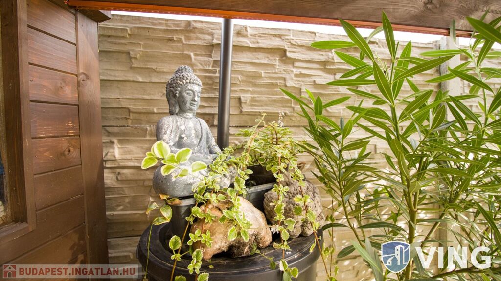 A 410 nm-es udvar minden négyzetmétere parkosított, mely a gondos tervezésnek köszönhetően tovább erősíti a ház kiemelkedő tulajdonságait.