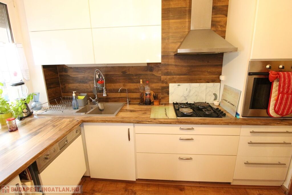 A konyhában egyedi gyártású konyhabútor, beépített háztartási gépekkel felszerelve, elektromos sütő, tűzhely, páraelszívó és mosogatógép.