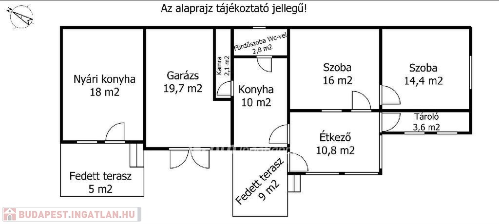 A ház helyiségei: két hálószoba, konyha, étkező, fürdőszoba WC-vel, kamra, valamint tárolók. Az épülethez garázs és egy különálló nyári konyha is tartozik, amely – mivel fűtéssel ellátott – igény szerint könnyen átalakítható műhellyé, vendégszobává vagy akár vállalkozási célú helyiséggé.