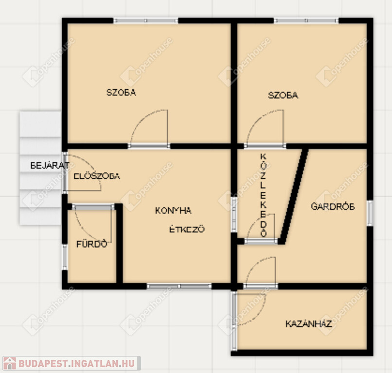 belső terek kialakítása jelen állapotában: előszoba, fürdőszoba, konyha-étkező, két külön nyíló kényelmes méretű szoba, közlekedő, fél szoba