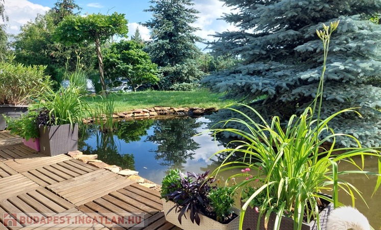 Kert: Örökzöld sövény, díszfák és egy hangulatos kerti tó díszhalakkal.