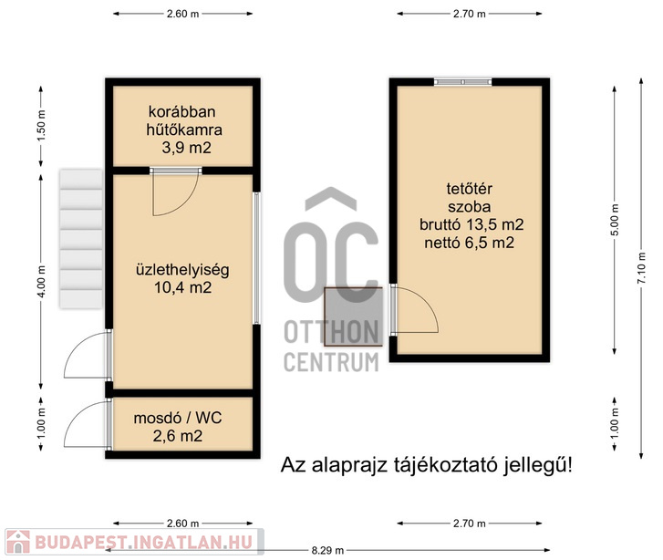 - A bruttó 13,5 m2 beépített tetőtér külső lépcsőn közelíthető meg.