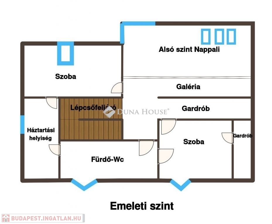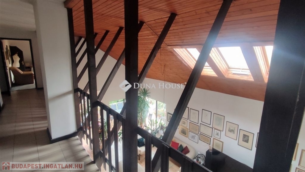 Emelet: két hálószoba, háztartási helyiség, gardróbszoba és fürdőszoba Wc-vel kapott helyet, valamint egy galéria, ahonnan rálátás nyílik az alsó szint nappalijára, különleges térérzetet adva a háznak.