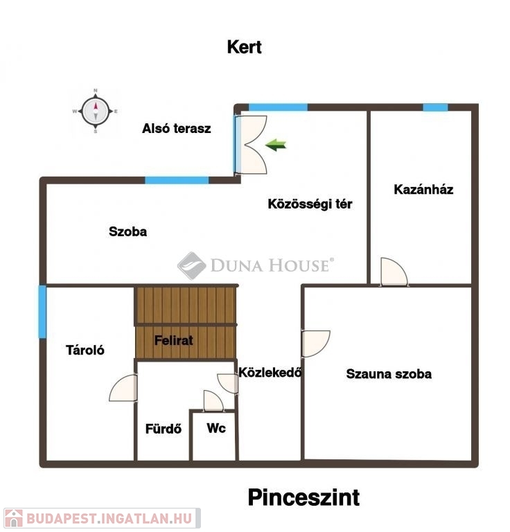 Pince szint: Ez egy belülről és kívülről is megközelíthető, teljesen külön használható szint, mely rengeteg lehetőséget rejt magában. Akár egy külön lakrész kialakítható, vagy egy vállalkozásnak is kiváló lehet, de a tulajdonos akár egy dühöngőt, billiárd vagy wellness részleget is kialakíthat itt. Jelenleg szaunaszoba, nappali, hálószoba, fürdőszoba, WC, több tárolóhelyiség, valamint a gépház található itt. (Ipari áram) Innen közvetlenül ki is juthatunk a kertbe. Ez a szint 145m2, melyet nem számoltam bele a lakótér alapterületébe.