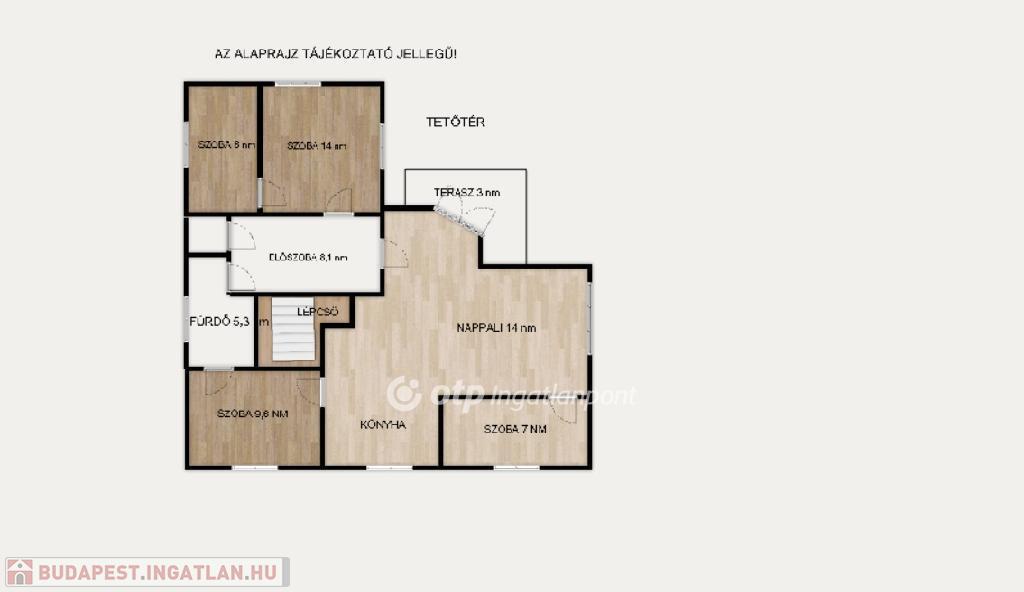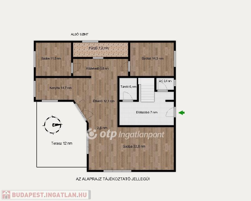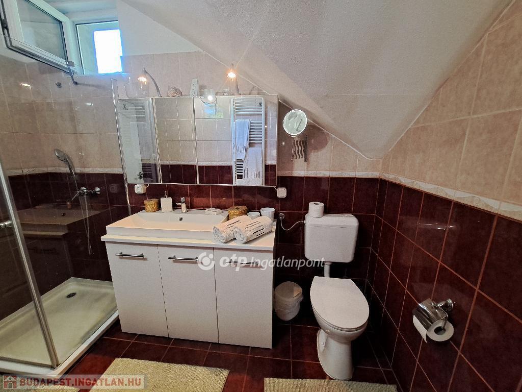 Az alsó szinten: tágas nappali, két hálószoba, étkezős konyha, fürdőszoba, gardrób és külön WC.
