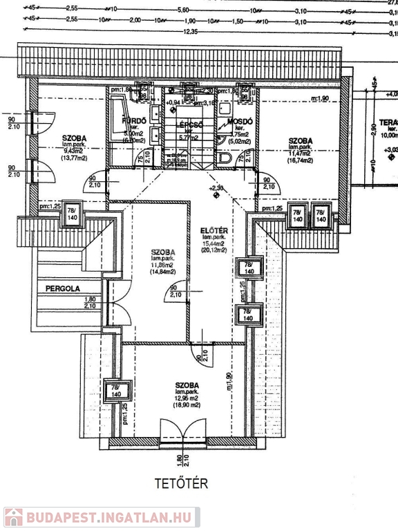 Emelet: 4 szoba (br. 18,9, 14,8,16,7 és 9,4 nm) 2 fürdőszoba (5,0 és 3,7 nm) + lépcsőház.
