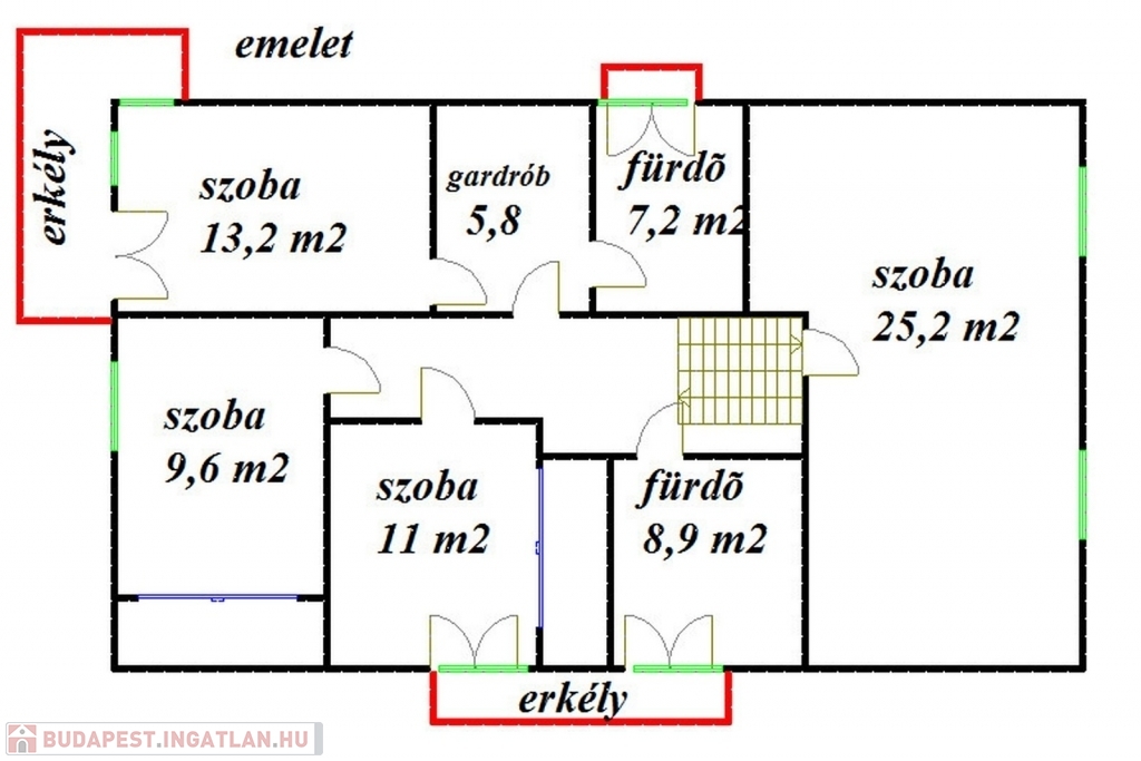 Az emeleti részen 4 külön nyíló szobát, 2 fürdőszobát és gardrób helyiségeket találhatunk.