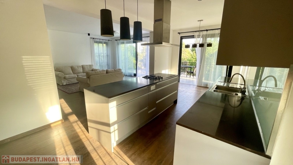 A z alsó részen egy tágas, napfényes, teraszkapcsolatos, amerikai konyhás nappali, egy dolgozó szoba, tároló és mellékhelyiség kapott helyet.
