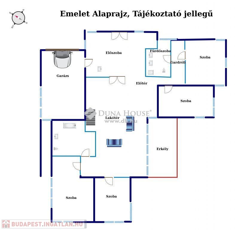 Az emeleten előszoba, előtér, két fürdőszoba (melyek közül az egyik káddal és mosdóval ellátott), közlekedő, négy hálószoba, egy gardrób.