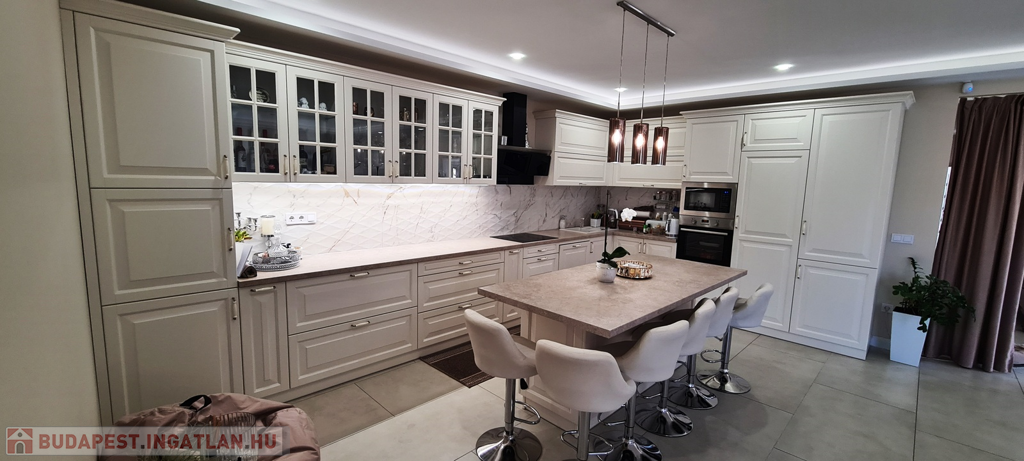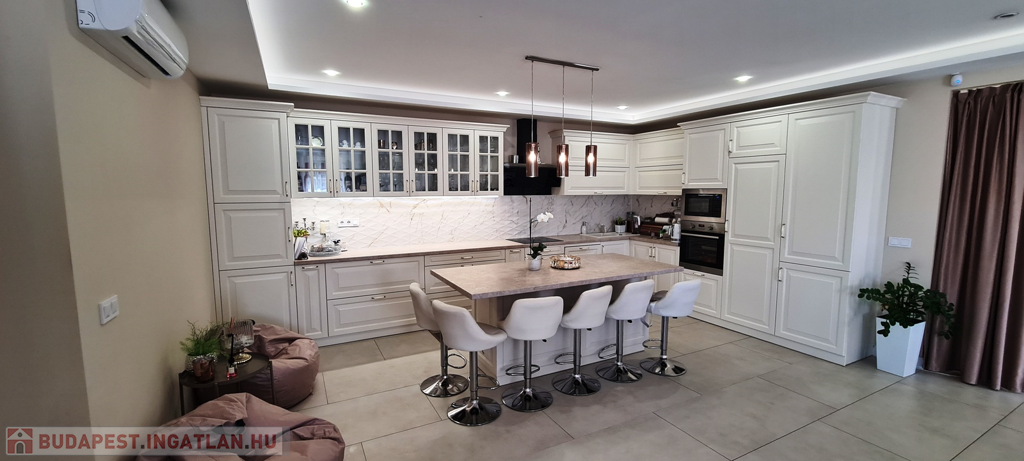 A családiház fűtését kondenzációs gázkazán biztosítja padlófűtéssel, hűtéséről pedig klímaberendezés gondoskodnak. Az egyedi készítésű konyhabútor  energiatakarékos háztartási gépekkel felszerelt, és nagy tárolási felületet biztosít. Az ingatlan szép napfényes szobái külön nyílnak, a magas minőségű burkolatokkal és szaniterekkel felszerelt modern fürdőszobák mellett még egy mosókonyha teszi komfortossá az ingatlant. A családi ház értékét növeli a nappalihoz kapcsolódó nagy fedett terasz, a 22nm-es elektromos kapuval felszerelt garázs, a kamerákkal összekötött riasztórendszer, a kamerás kaputelefon, és a mozgásérzékelővel ellátott kültéri világítás. Ha egy magas minőségű és modern családi házat szeretne ez egy jó lehetőség lehet az ön számára.