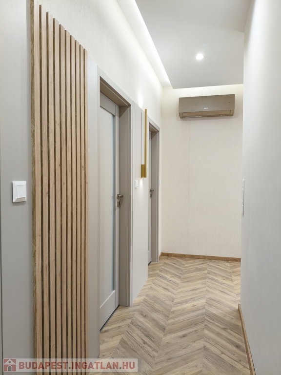 A lakás járólap és laminált padló burkolatokkal, hőszivattyús padlófűtéssel, valamint inverteres hűtő-fűtő klímával felszerelt. A 3 rétegű üvegezésű műanyag nyílászárók elektromos alumínium redőnyökkel rendelkeznek, biztosítva az energiahatékonyságot és a kényelmet.
