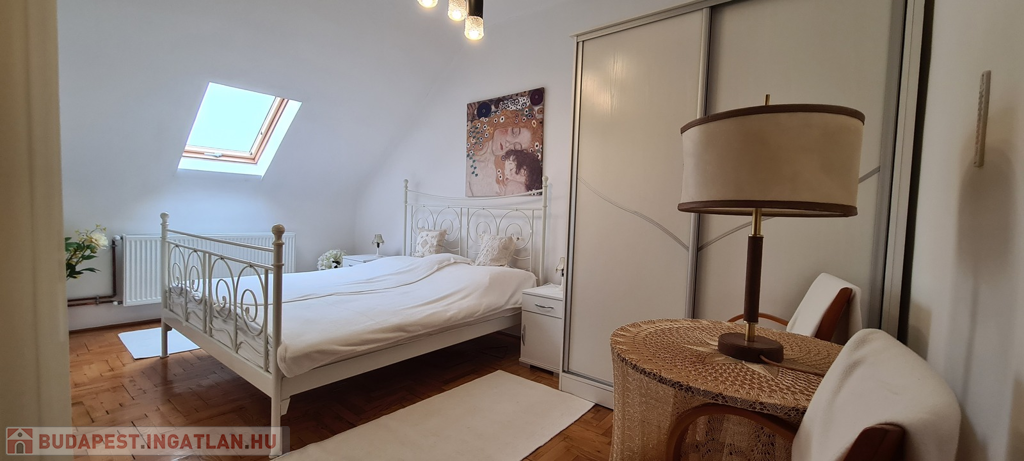 riasztórendszerrel ellátott,redőnnyel és rovarhálóval felszerelt műanyag nyílászárós, járólap és laminált padló burkolatú.
