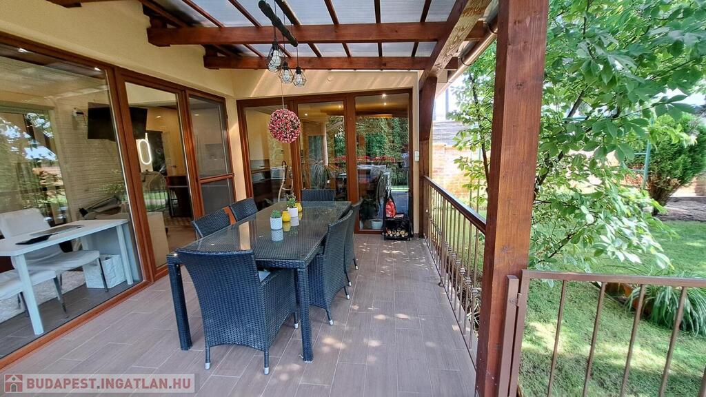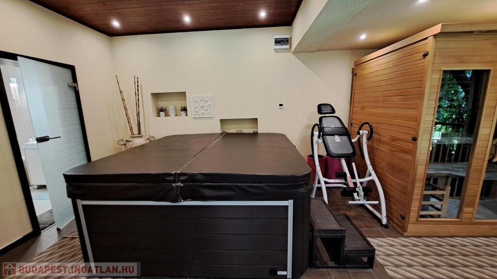Extrák: Teljes körű wellness részleg (szauna, jakuzzi), elektromos padlófűtéses télikert, riasztó- és kamerarendszer, központi porszívó, elektromos redőny, ipari áram