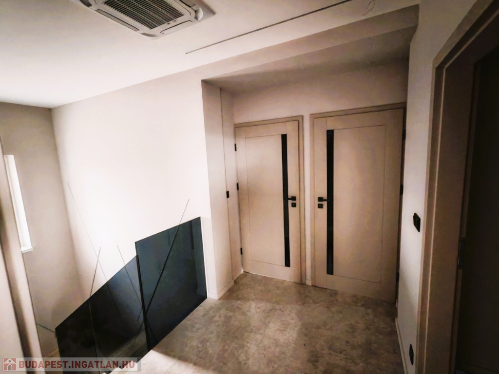 Felső szint: 3 külön nyíló szoba, fürdőszoba - WC, gardróbszoba.