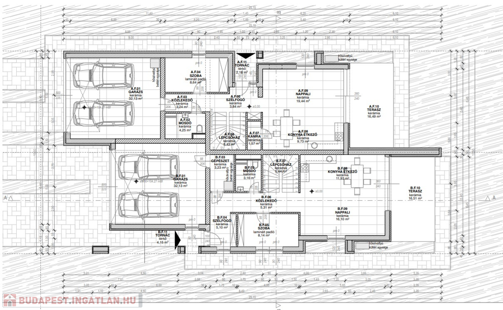 Földszint: amerikai konyha nappali-teraszkapcsolattal, 2 állásos garázs