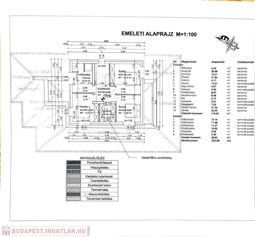 Emelet: 3 szoba, gardrób, fürdőszoba + WC