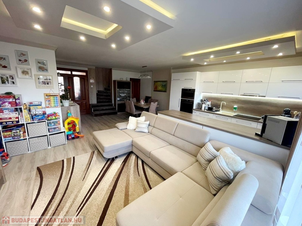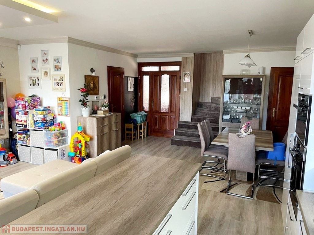 Elrendezés:Az alsó szinten található a nappali, konyha, étkező, fürdőszoba WC-vel, valamint a kamra.A felső szinten 3 különálló szoba, illetve egy második fürdőszoba WC-vel.