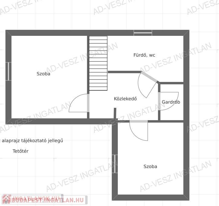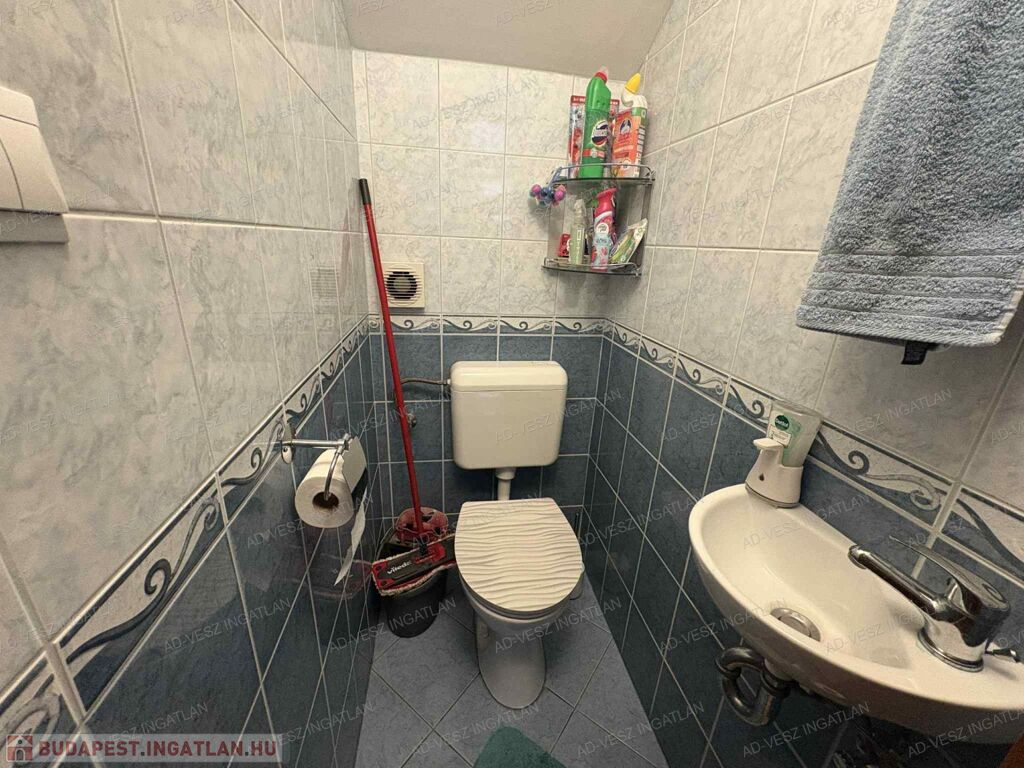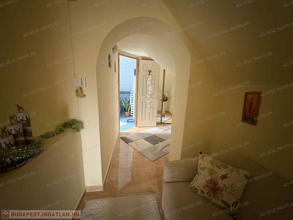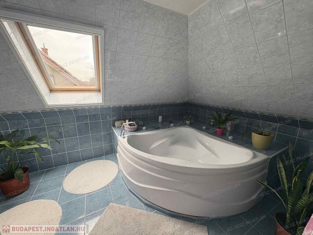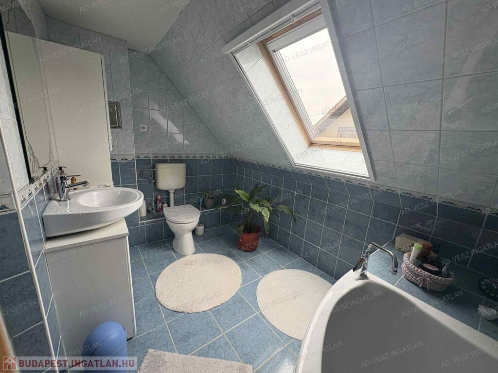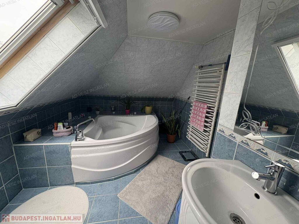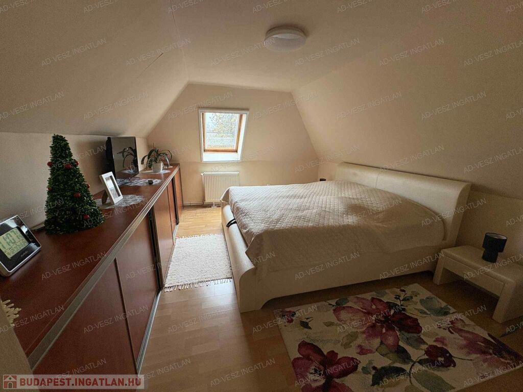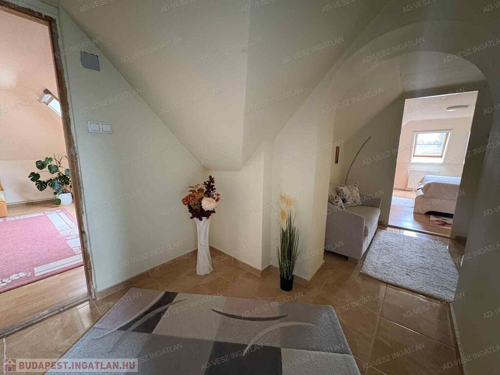 A tetőtérben további 2 hálószoba, fürdőszoba wc-vel, gardrób szoba, és közlekedő található.