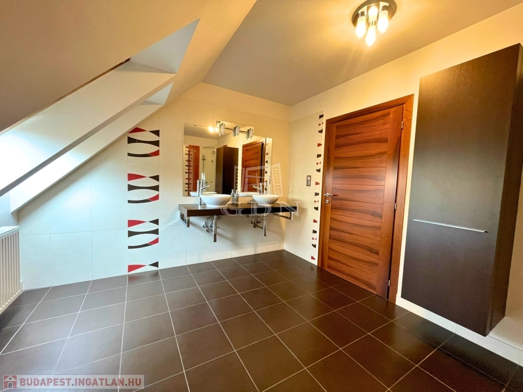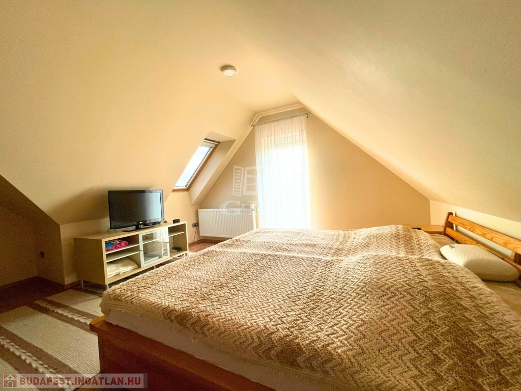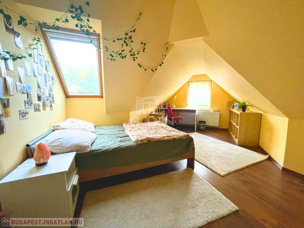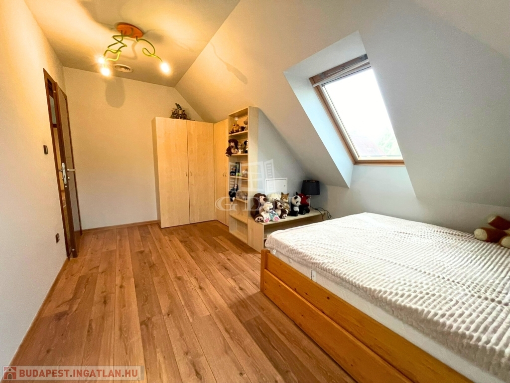 A nappali impozáns eleme sötétszínű, kényelmes lépcső, amely a tetőtérbe vezet. Itt 3 hálószoba és egy zuhanyzó+WC kapott helyet, kis előtérrel. A szobák hangulata a tető összetett kialakítása miatt igazi elvonulós, pihenős, privát helyek a család kisebb-nagyobb tagjai számára.