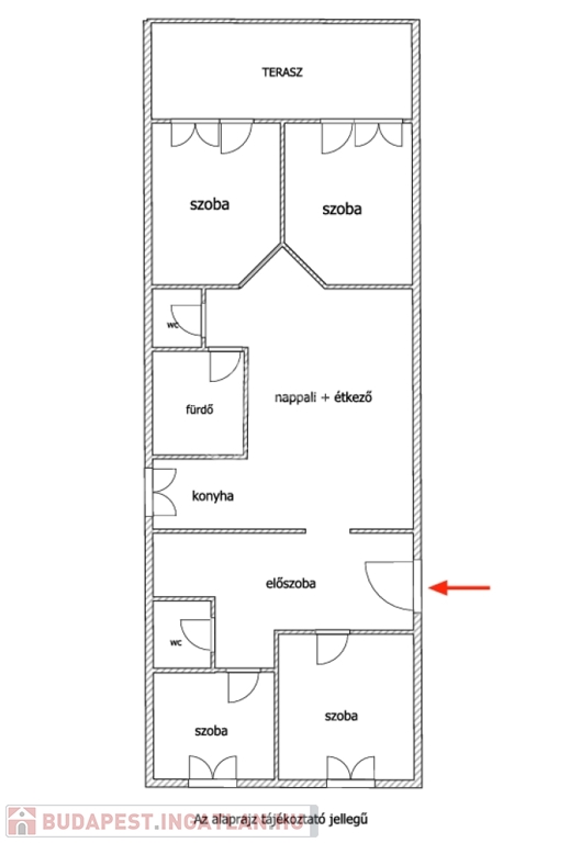 Felosztása: 4 hálószoba, 1 amerikai konyhás nappali, 2 mellékhelyiség, egy fürdőszoba, terasz.
