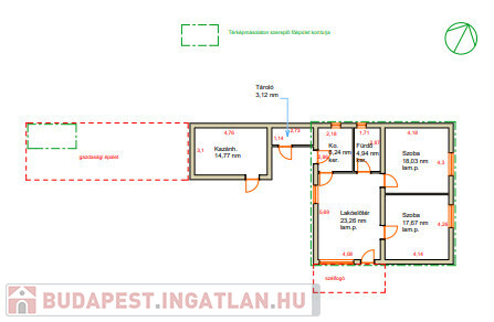 Az ingatlanban található egy tágas, 23,26 m²-es lakóelőtér laminált parkettával burkolva, amely barátságos fogadóteret biztosít. Innen nyílik két kényelmes méretű szoba: az egyik 17,67 m², a másik 18,03 m², mindkettő laminált parkettás, világos és jól berendezhető. A 6,24 m²-es konyha és a 4,94 m²-es fürdőszoba kerámia burkolatot kapott; ezek 10 évvel ezelőtt felújításon estek át, így jó állapotúak, esztétikusak. A házhoz tartozik egy 3,12 m²-es tároló, valamint egy tágas, 14,77 m²-es kazánház is, amely praktikus megoldást kínál a gépészet és további tárolás számára.