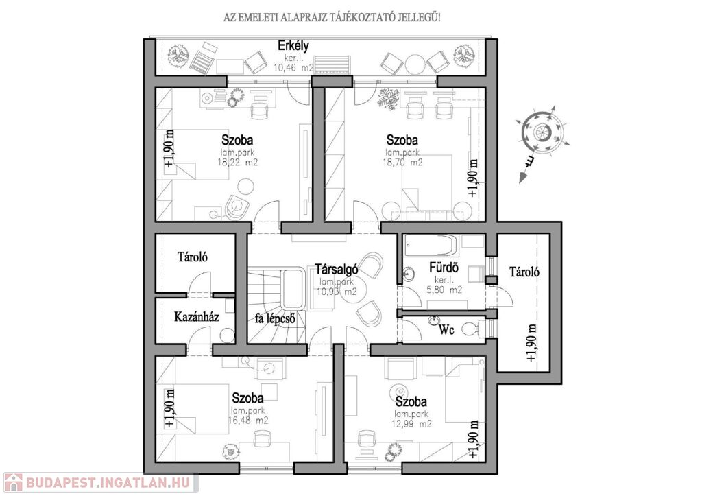 - Emelet hasznos: ~96,00 m2, (~10,00 m2 Erkély)