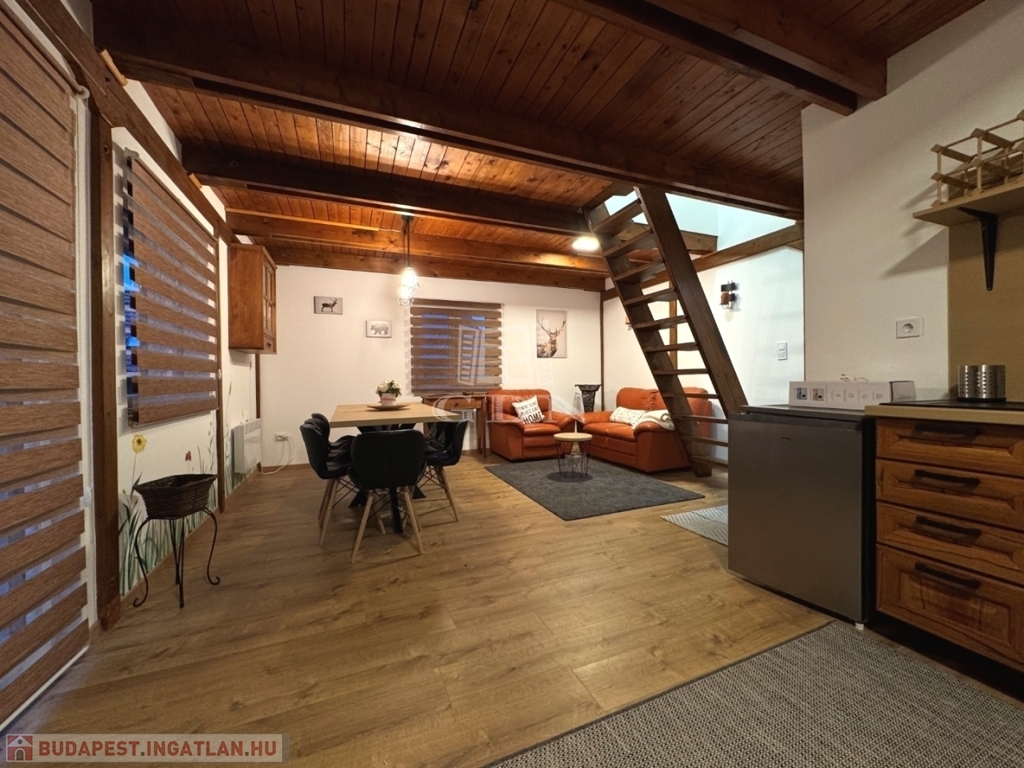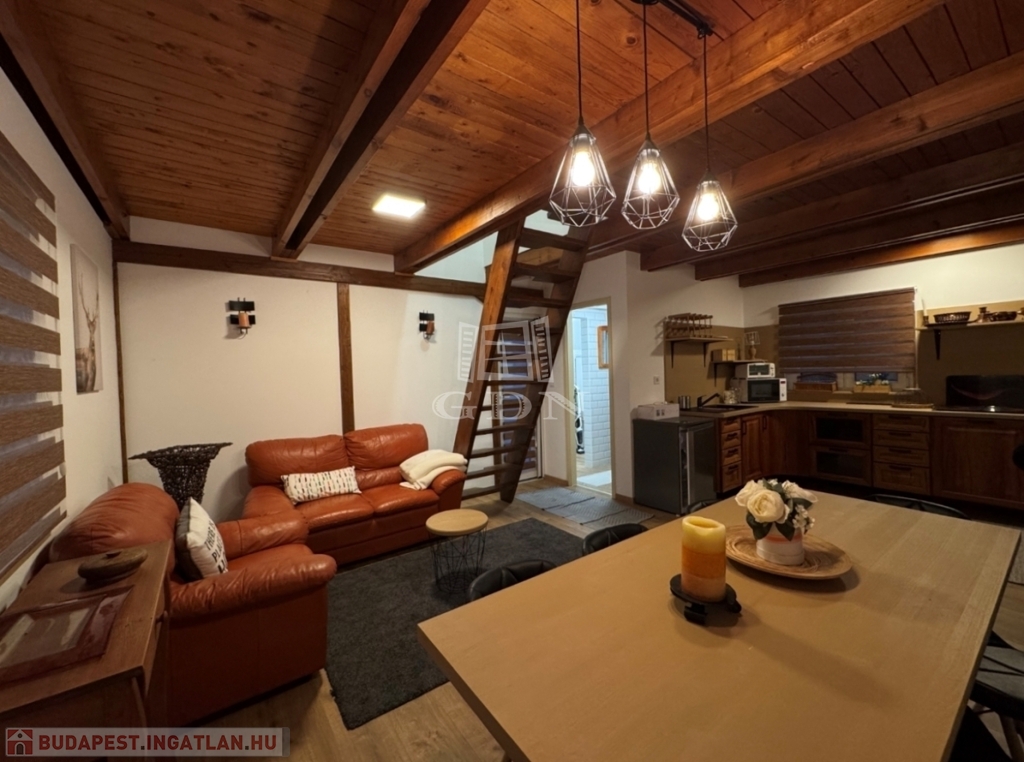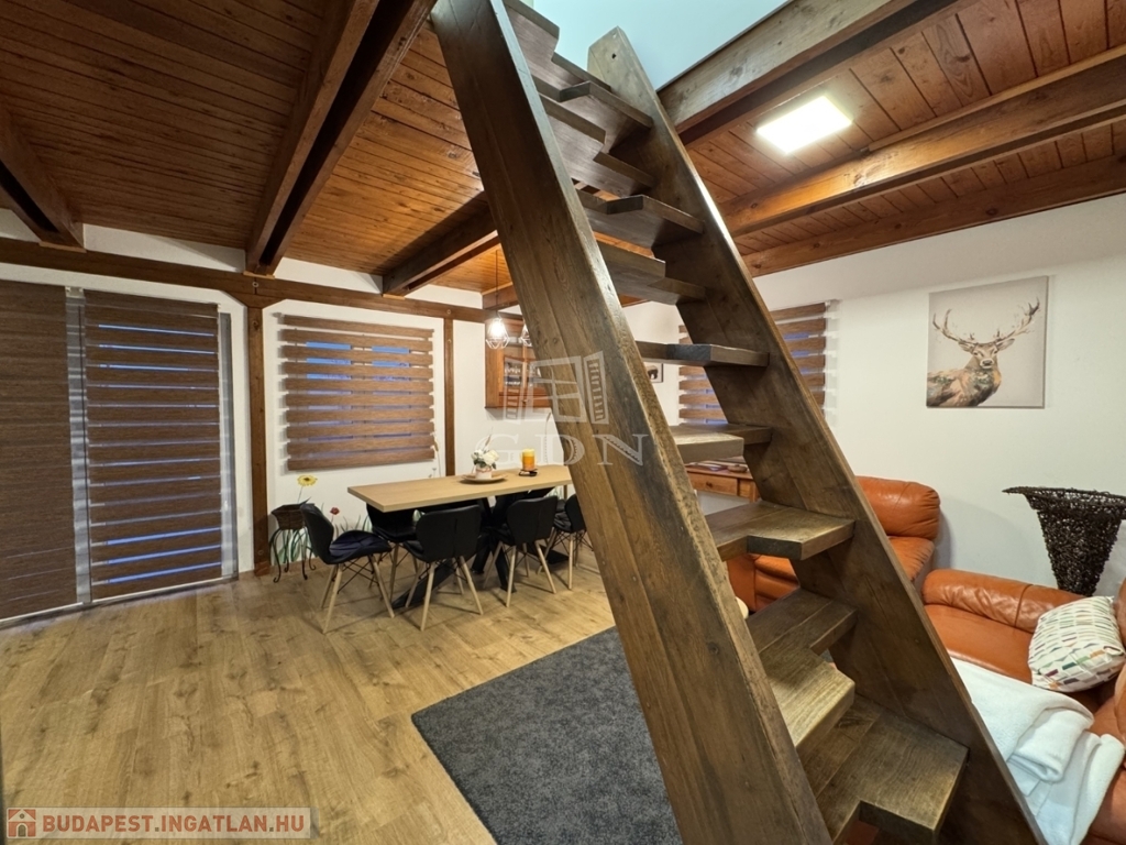 A földszinten amerikai konyha, fürdőszoba és WC található. A tetőtér beépített, két szoba került kialakításra.