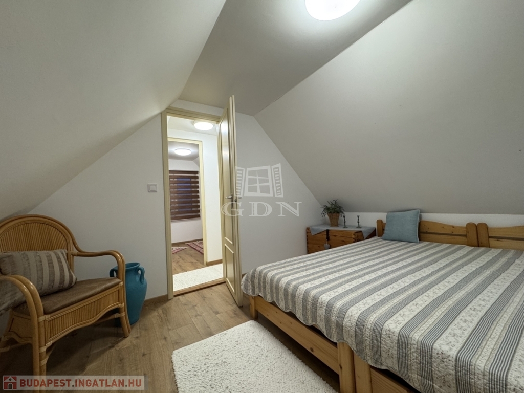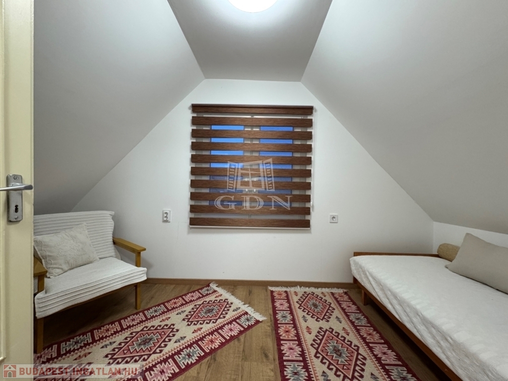 A földszinten amerikai konyha, fürdőszoba és WC található. A tetőtér beépített, két szoba került kialakításra.