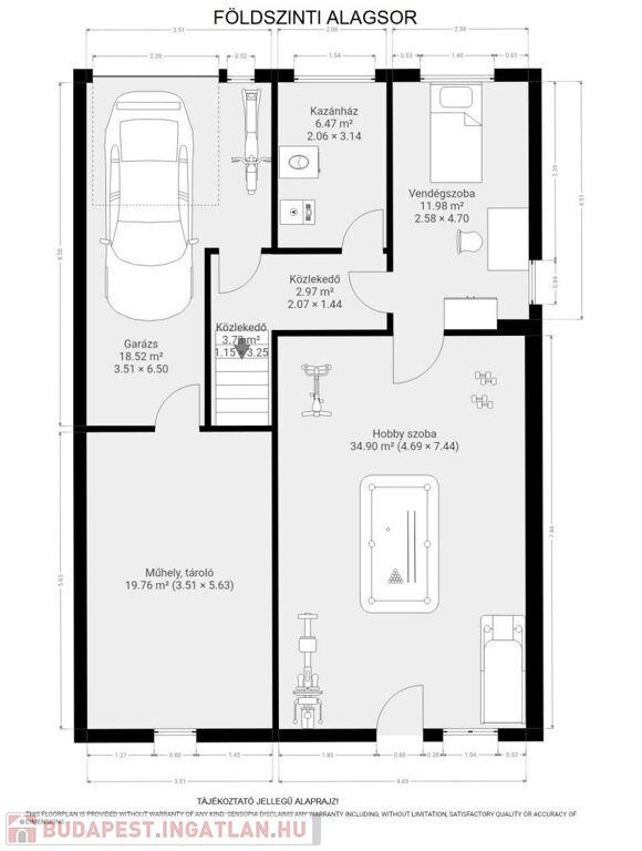 Itt helyezkedik el a garázs, a kazánház és mosókonyha, egy vendégszoba, valamint tároló helyiségek, amikben akár konditermet, műhelyt, hobbiszobát lehet kialakítani, vagy vakár üzleti tevékenység folytatására is alkalmas.