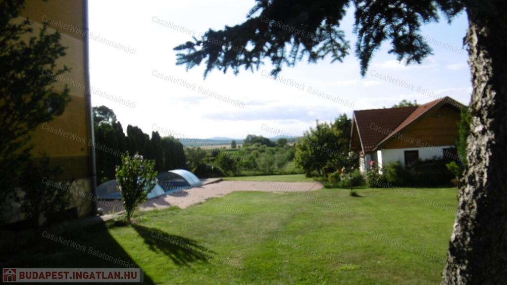 - a gondozott portát két részre osztották: a családi ház melletti füvesített területen helyezkedik el a nagyméretű fedett medence, a kerti kiülő, a virágoskert ... minden, ami egy kényelmes otthonhoz kell; a távolabbi gondozott udvar közel 180 gyümölcsfával büszkélkedik; ha még távolabb tekintünk, zavartalanul elláthatunk egészen a Bakony lábáig