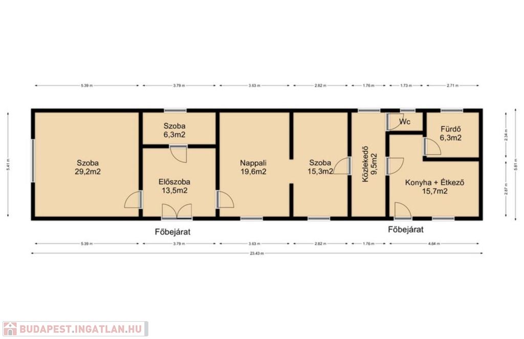 Belső lakrész helységei: nappali, 3 szoba, előszoba, közlekedő, külön fürdő, külön mellékhelység, konyha étkező.