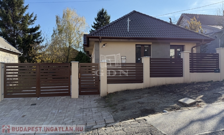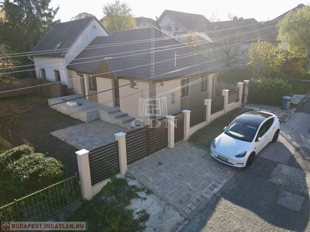 A térkövezett járda és autóbeálló, elektromos kapu, valamint a modern, letisztult kerítés tovább emeli a ház kényelmét és esztétikáját.