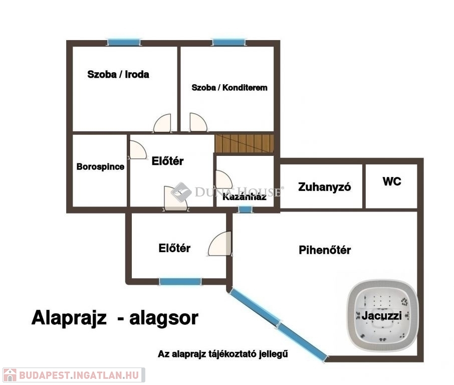 * Alsó szinten: pince/tároló + fogadótér, edzőterem, iroda