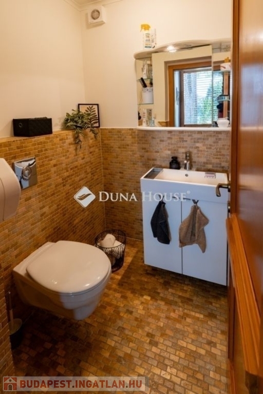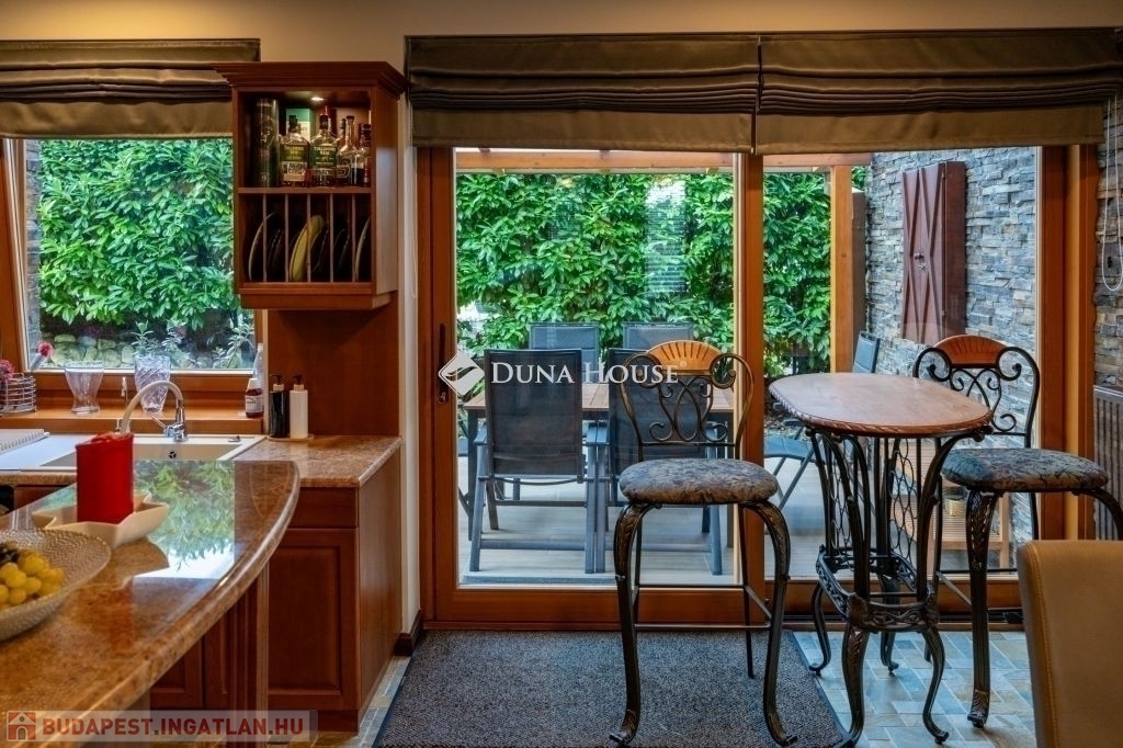 Ezenkívül egy külön 55 m²-es lakást, egy 2 beállásos garázst, tárolókat, valamint egy több mint 100 m²-es, természetes kőburkolatú terasszal, pergolával ,parkosított kerttel, halas tóval .