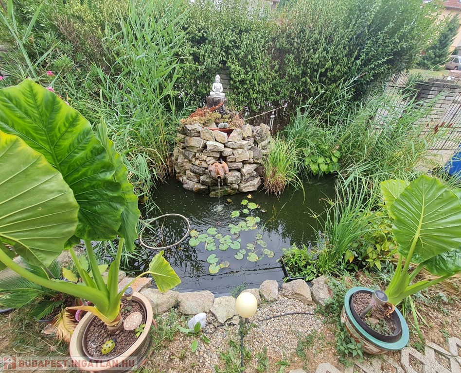 A 1304 m²-es telek keleti tájolású, gondozott, lejtős kialakítású. Az udvarban fúrt kút biztosítja az öntözést, emellett kisméretű medence és melléképület is található, amelyben barkácsműhely és pince kapott helyet. A hátsó, lépcsősen kialakított, bekerített telekrész ideális veteményesnek vagy pihenőkertnek.