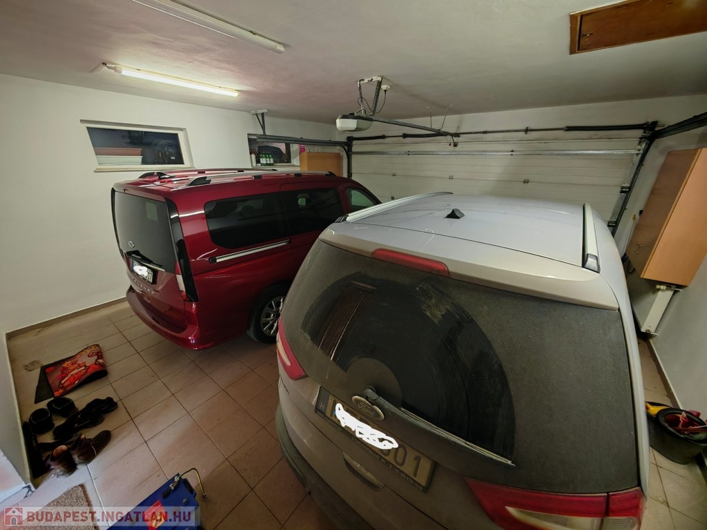 Az ingatlanhoz tartozik egy elektromos kapuval ellátott, 36 m²-es duplagarázs, amely két nagyobb autó számára is kényelmes helyet biztosít. Ezen felül további parkolási lehetőségek is rendelkezésre állnak a ház előtti parkolóban.