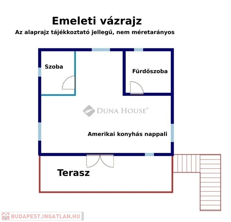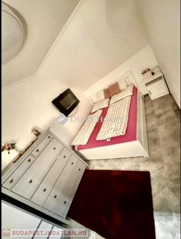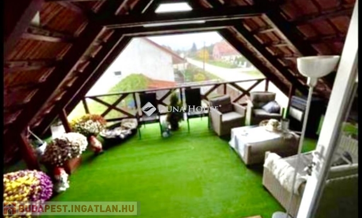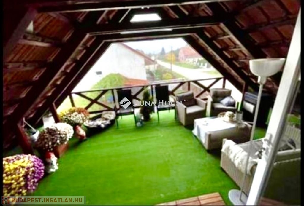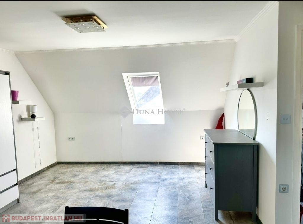 A ház mellett került megépítésre egy külső lépcső, mely felvezet minket az emeletre. Itt is található egy az udvarra néző 20nm tetőtéri terasz. A bejárati ajtaja és ablakai az emeleti lakásnak szintén műanyagok már. Belépve az ajtón egy tágas, napfényes amerikai konyhás nappalis kialakítás kapott arcot 2024-ben. A nappaliból nyílik egy hálószoba és egy zuhanyzós fürdőszoba. A nappali nagyságából adódóan szükség szerint még egy kis szoba kialakítható akár. Emeleti belmagasság 2,36m.