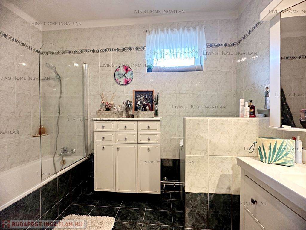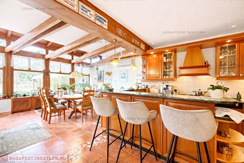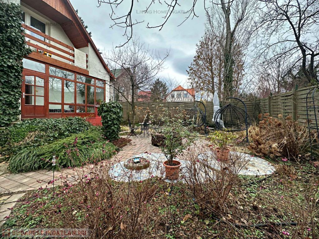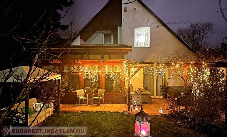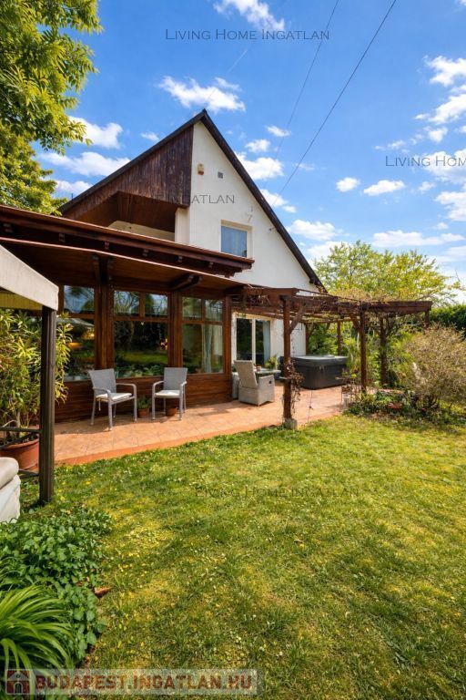 This impressive property is for sale in a newly built family home neighborhood with panoramic views of Nagykevély and Ezüsthegy. The exterior of the house is unique with green vegetation, wooden beams and terraces creating a warm, friendly, Mediterranean atmosphere. The 775 m² garden is planted with ornamental plants, shrubs and flowers, and is illuminated by atmospheric lights in the late evening hours. The relaxation area features a barbecue, a fire pit, a swing bed, and a garden dining area. The paved terrace is the perfect place for summer evenings and gatherings with friends and family.