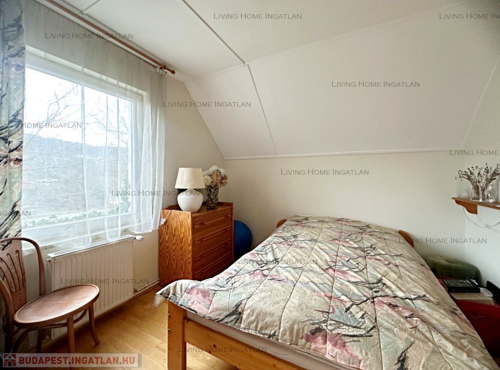 Emelet: 3 szoba, gardrób, fürdő, közlekedő. Az erkélykapcsolatos szobából panorámás kilátás nyílik a kertre és a környező hegyekre.