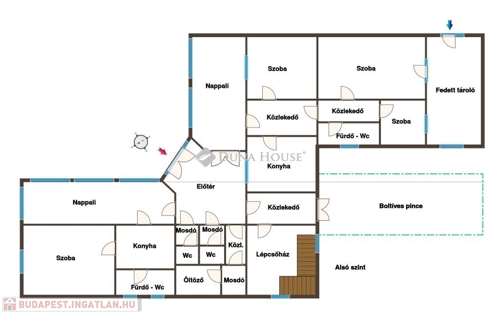 Az alsó szint jelenleg felújítandó állapotban van, itt akár további apartmanok, lakótér kialakíthatóak, de vállalkozási, akár ügyfélfogadási, vagy más üzleti célra is remekül hasznosítható. A két szint külön külső bejáraton át is elérhető, de belső lépcső is összeköti őket.