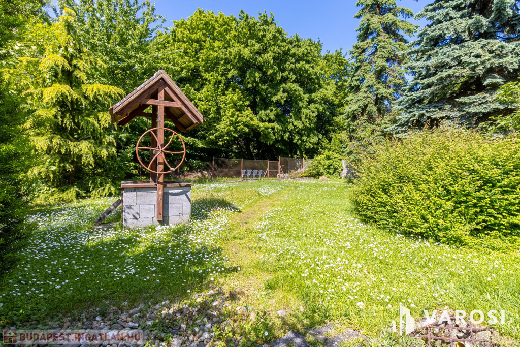 A ház egy 957 m²-es telken helyezkedik el, amely ideális méretű: könnyen karbantartható, mégis élhető kert. A telek hátsó részén egy kis patak csörgedezik.
