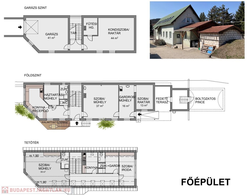 Eladó Pilisvörösváron egy családi ház jellegű ingatlan, amely jelenleg üzem/üzlet besorolású, de teljes értékű lakóházként is használható lehet. Az 1469 m²-es telken 308 m²-es üzlet/üzemépület (garázsszint + földszint + tetőtér) és 78 m²-es raktár található, további bővítményekkel. Az ingatlan gyönyörű panorámás kerttel, kertvárosias környezettel és kiváló tömegközlekedéssel rendelkezik. Ideális többgenerációs családi otthonnak, otthon + vállalkozás kombinációnak vagy tágas lakóingatlannak. A raktárépület is átalakítható különálló lakóépületnek.