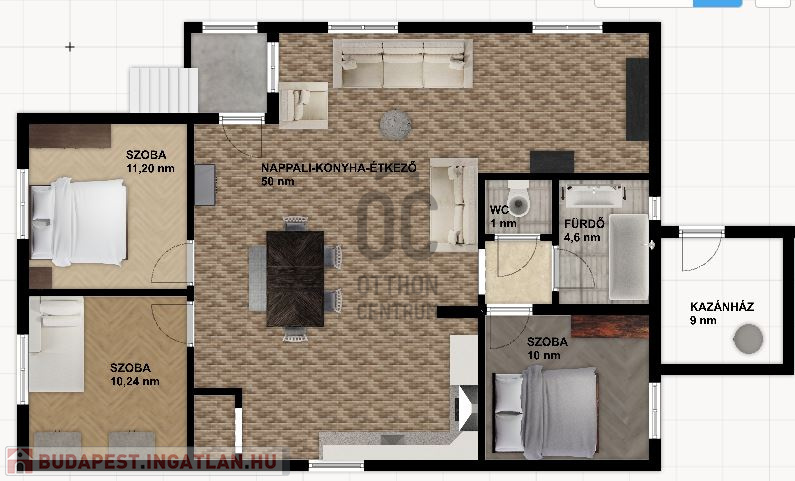 Az 50 nm-es nappali/konyha/étkező részből igény és szükség szerint leválasztható még egy 9 nm-es szoba (eredetileg is le volt választva).